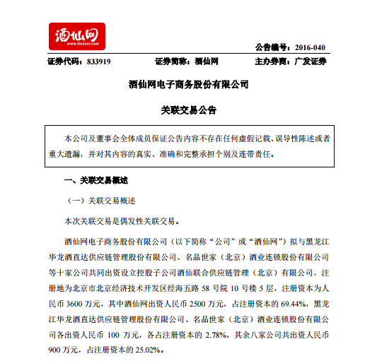 7月15日,酒仙網對外發布公告稱,擬與10家公司共同出資建立控股子公司:酒仙聯合供應鏈管理(簡稱:酒仙聯合),該子公司注冊資本為人民幣 3600 萬元。
