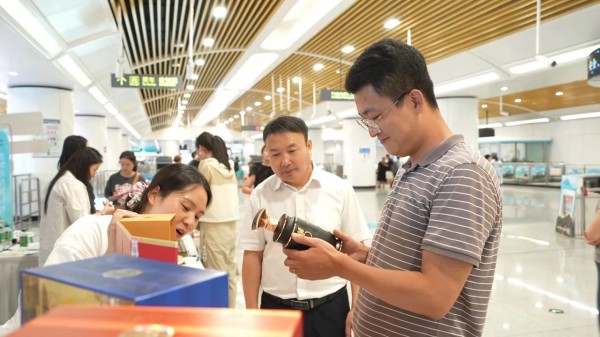 在機場地鐵站陜西白水杜康酒展示區,展位設計融合了酒圣杜康傳統釀造元素與現代視覺表達,醒目的"酒圣杜康酒"標識與白水地域特色相得益彰。酒廠工作人員向來往乘客詳細介紹陜西白水杜康酒的歷史淵源、釀造工藝和產品特點,并邀請品嘗經典酒品。