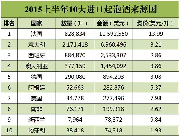 2015 上半年,我國進口起泡酒總量為 4,857,009 升,同比下降 14.09%;進口總額為24,595,860 美元,同比下降 33.58%;均價為 5.06 美元/升,同比下降 22.75%。起泡酒呈現出了下跌態勢。