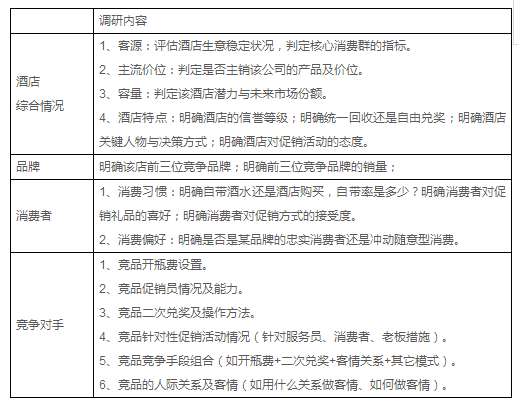 – 競品信息:了解前三位競品每日動銷情況、促銷員工作情況、促銷活動情況、客情情況(關鍵人物關系情況)、陳列情況、兌獎情況及方式、暗銷情況。
